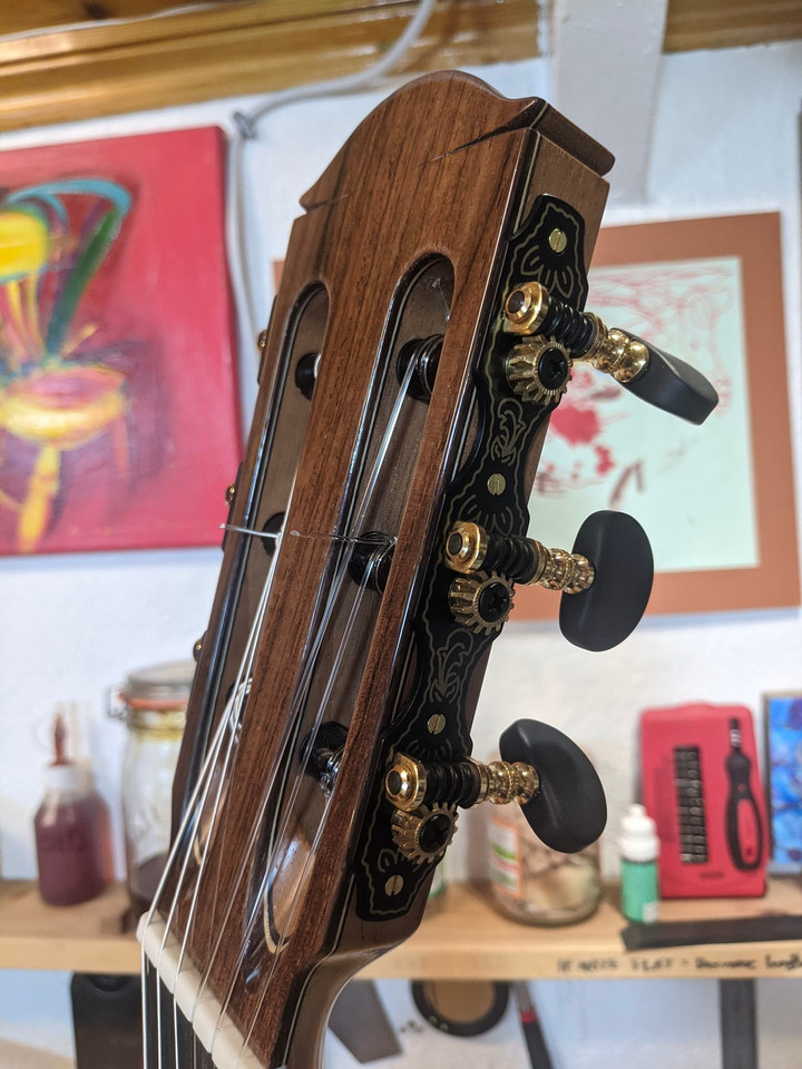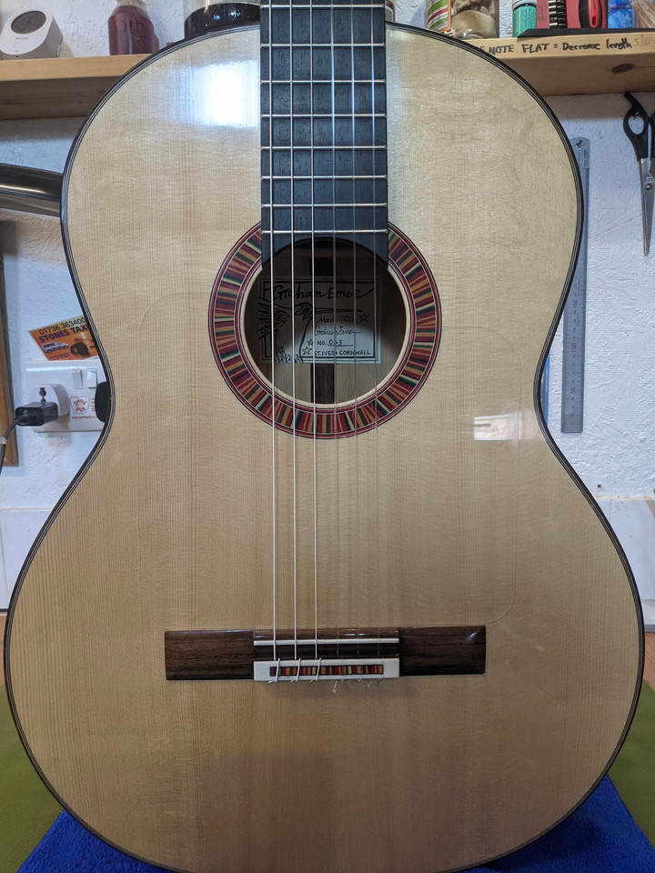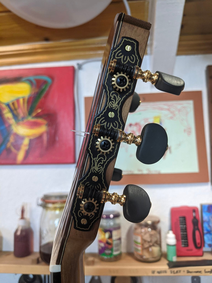 Featuring my rainbow rosette and matching tie block detail, combined with the striking timber, she's a good looker too. The machine heads are Der Jung with ebony buttons and roller bearings for smooth action. As with all my guitars, she will come in the safety and comfort of a Hiscox pro case.